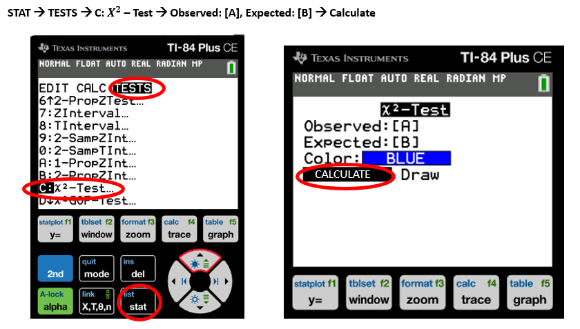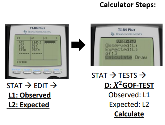 1) Enter the data (Stat, enter, observed vals go in L1 and expected vals go in L2)