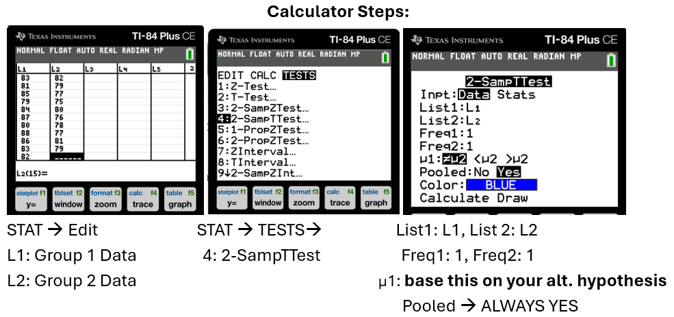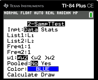 2) Run the test (Stat, TESTS, 4:2-Samp-T-Test)