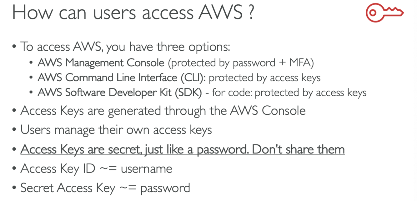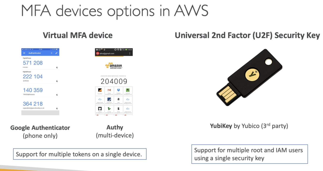 What are the two kinds of MFA in AWS? What is the key:user ratio for both?