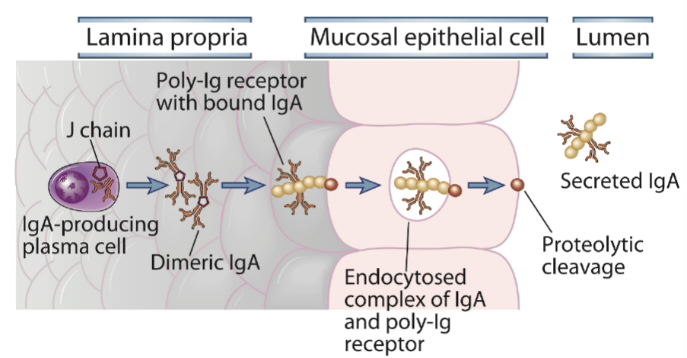 B-lymfocyt utsöndrar IgA som dimerar och binder med J-kedja till receptorer på basalsidan av epitelceller varpå komplexet med receptor genom endocytos går in genom epitelcell och vid utpassering till apikalsidan klyvs komplexet och kan nu fungera som sIgA