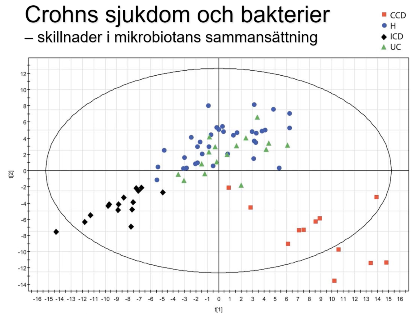 Friska (H) och ulcerös colit (UC) har ganska lika tarmfloror