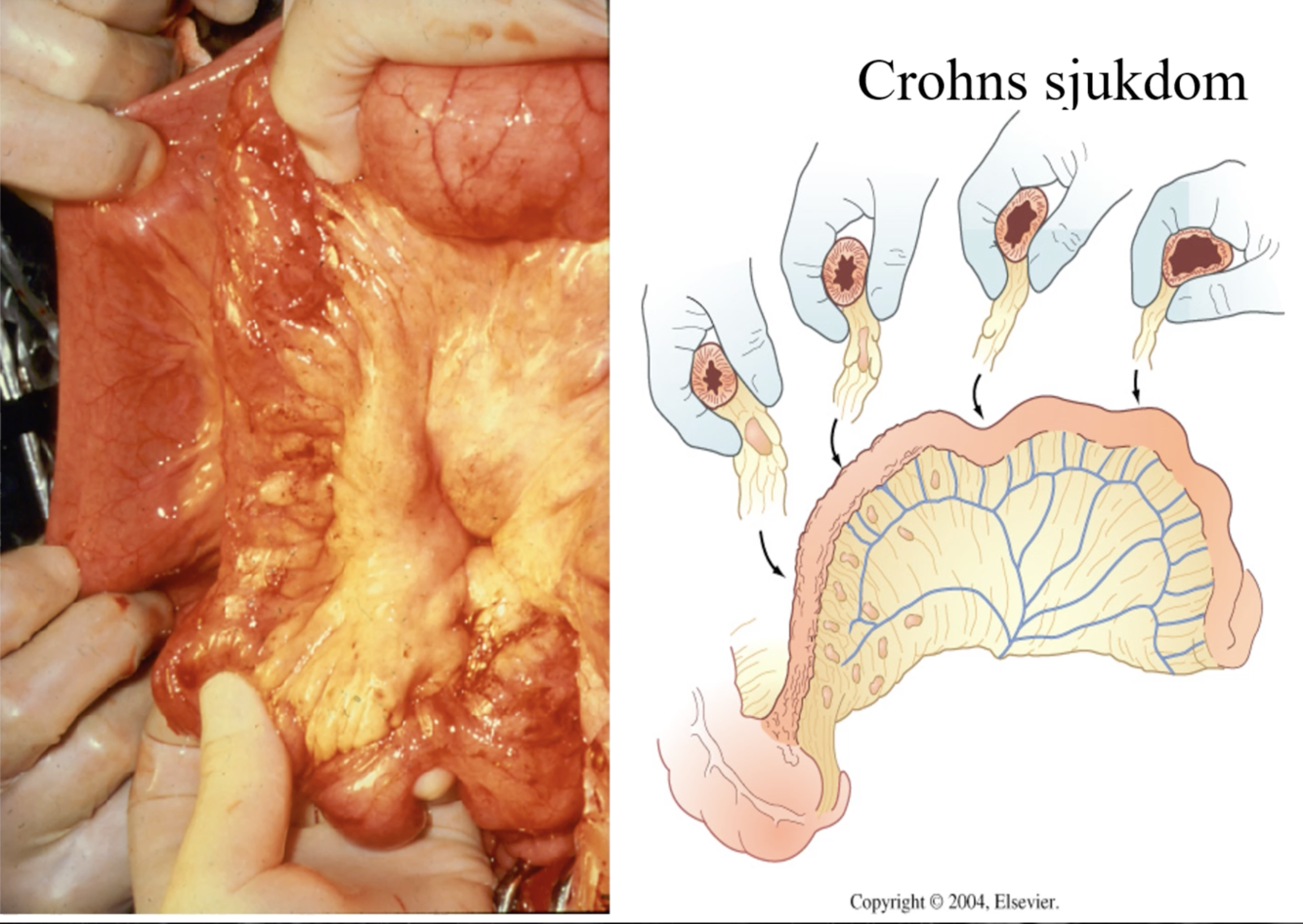 Bilden visar mesenteriet som vid en frisk tarm ansluter till tunntarmen och slutar där, medan vid crohns ibland växer runt och omringar hela tarmen. Man får då ofta en vidgning av tarmen uppströms av förträningen.