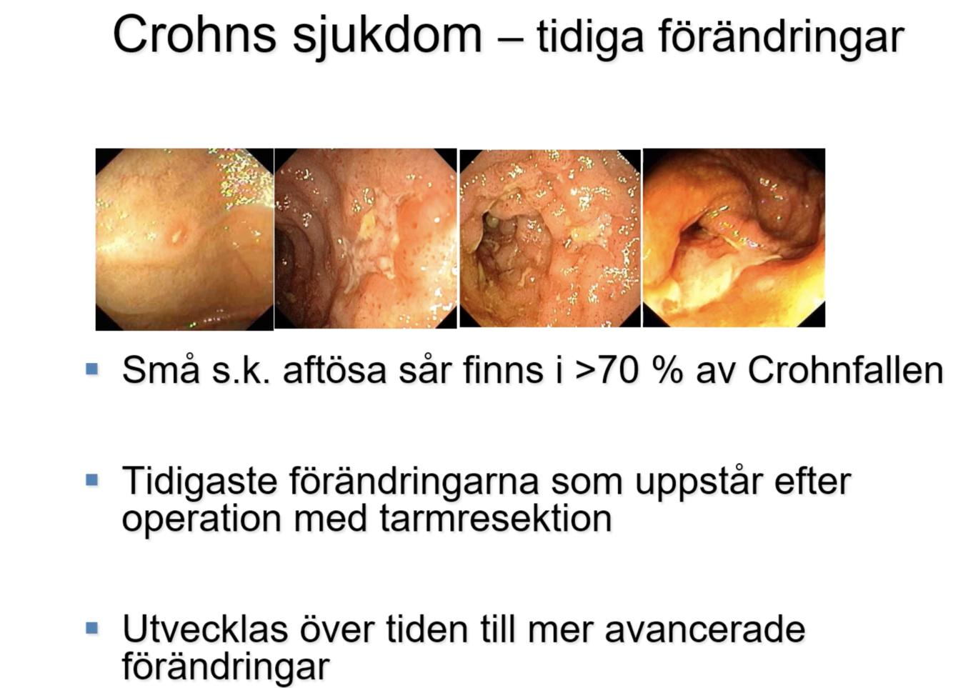 Man kan se försnävingar. Crohns är en transmural inflammation och väggen kan bli tjock medan lumen snävar ihop och nästan försvinner.