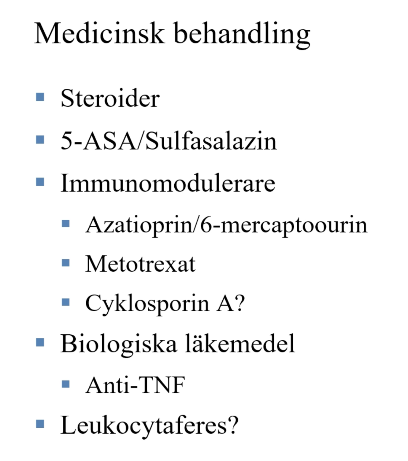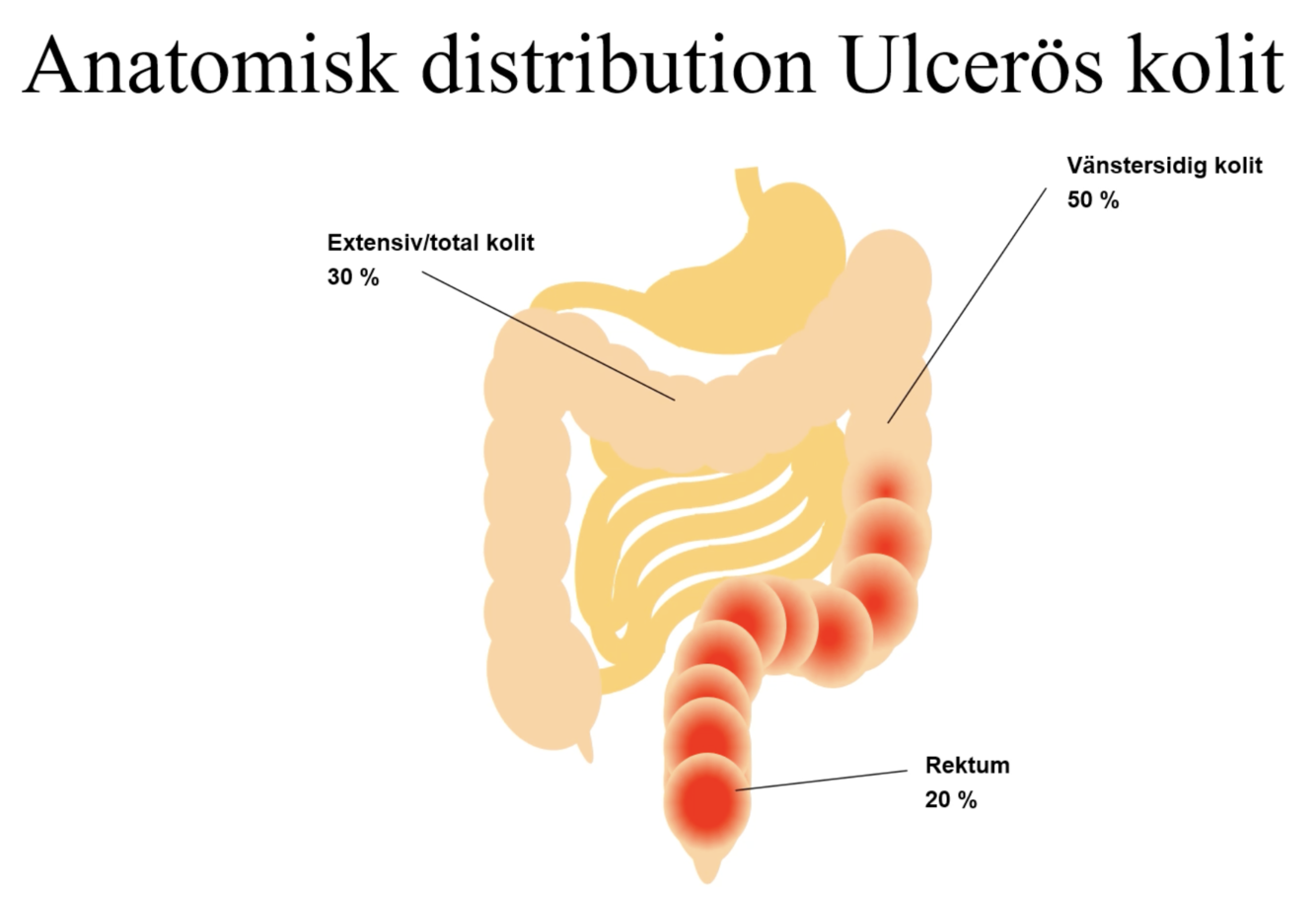 Olikheter: enbart kolon (börjar i rektum och breder ut sig proximalt). Denna är inte en transmural sjukdom, utan inflammationen sitter bara i slemhinnan. Denna är också kontinuerlig, dvs inte “fläckvis” som crohns.
