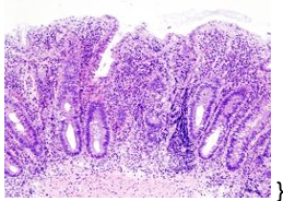 Describe how you differentiate between recent v chronic UC via a histology sample? [1]