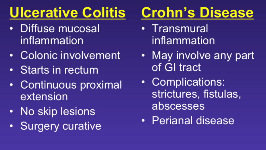 distinguishing features b/t UC and Crohn’s disease