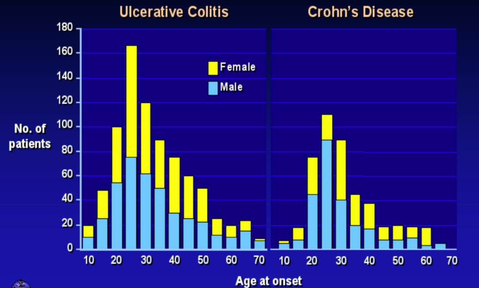 more males have Crohn’s, similar age distrib (highest onset rate in 20s-30s)