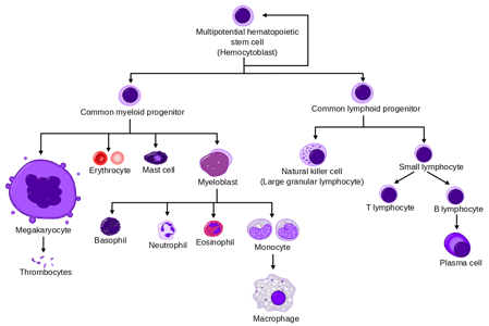 Hierarkisk organisation av blodbildningen och tidig förgrening kan förklara utvecklingen av olika typer av leukemi (HSC (hematopoietic stem cell), CMP (common myeloid progenitor), GMP (granulocyte myeloid progenitor), CLP (common lymphoid progenitor).