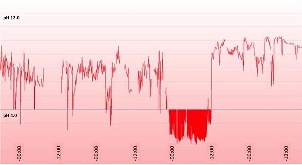 This patient has a multitude of GI symptoms, including heartburn and dyspepsia, as well as IBS. This constellation of sensory GI symptoms increases the likelihood that she has a functional GI disorder. Her capsule pH study demonstrated minimal acid exposure, with the exception of the third night of the study, when she experienced a prolonged period of acid exposure (around 12 hours at a pH <4). It is important to recognize that this observation reflects dislodgement of the capsule from the distal esophagus, with passage into the stomach (followed by an increase in pH as the capsule migrates from the stomach into the small bowel). This segment of the study should be excluded from analysis in order to avoid a false positive interpretation. Treatment efforts to further suppress acid production thus are unlikely to improve her symptoms. Baclofen can be used to decrease transient lower esophageal sphincter relaxations and thus improve reflux, and anti-reflux surgery can be an effective definitive treatment for reflux. However, neither would be indicated in view of the low degree of reflux evident on this pH test. Given the high degree of perceptive GI symptoms in this patient, she would be a reasonable candidate for a trial of tricyclic antidepressant, with the potential to improve all of her sensory symptoms.
