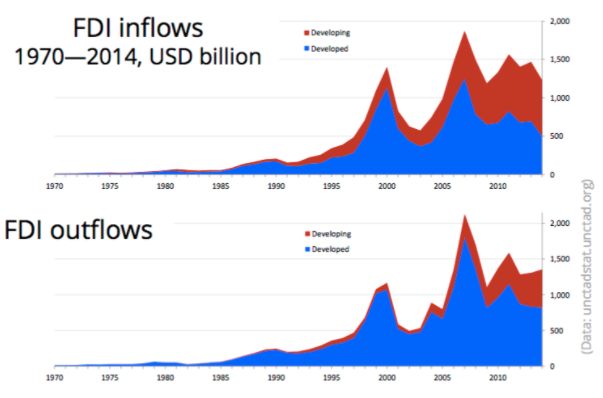 Although FDI inflows and outflows and international trade has increased with double-digit multiples in a matter of decades, not much of it is global.