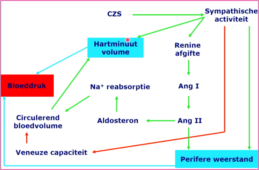 Bloeddruk wordt gereguleerd door het hartminuutvolume en de perifere weerstand. Angiotensine en de sympathicus geven vasoconstrictie en zorgen voor de verhoging van de perifere weerstand.