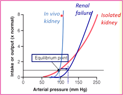 Gestoorde druknatriurese = nierinsufficiëntie kan hypertensie veroorzaken door het onvermogen van de nier om bij een normale bloeddruk voldoende water en natrium uit te scheiden. (het evenwicht tussen inname en uitscheiding komt bij een hogere bloeddruk en de lijn loopt minder steil).