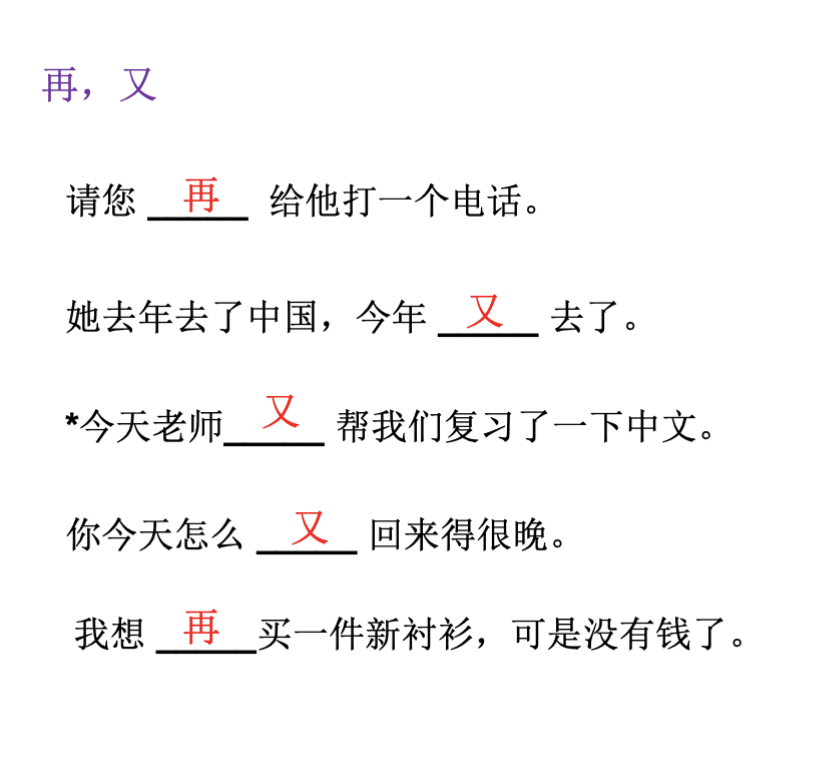 EX: 昨天我吃了中国菜,今天又吃了中国菜,明天我会再吃中国菜。