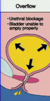 Obstruction or loss of neurological control results in a constantly full bladder that dribbles