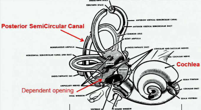 Posterior semicircular canal. It has a dependent opening to the utricle, which houses all the otoconia that can dislodge, move to the cupula and trigger excitation of the ampullary nerve, causing a burst of vertigo.