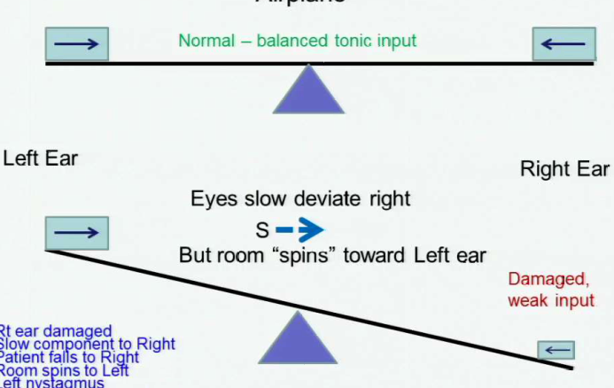 Right ear. Damage to the right side will cause the eyes to deviate right. This will cause the room to “spin” towards the left ear.