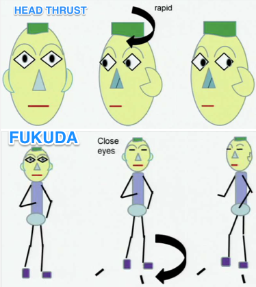 Covered fundus exam (fixation on an object will suppress nystagmus in patients who have latent VN), Head thrust exam (rotate pt’s head from forward position while patient is fixated on your nose. If eyes fall from nose in left rotation, left ear is damaged), Fukuda step test (close eyes, march in place, if patient rotates right, right ear is damaged