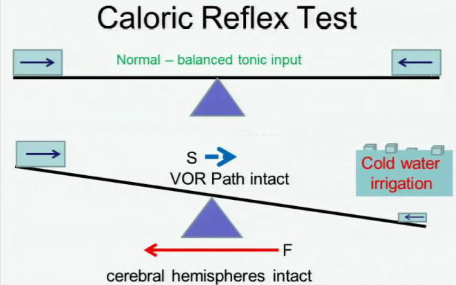 Caloric reflex test. Put cold water in one ear. The eyes should deviate towards that ear with a rapid nystagmus away from it. Put warm water in one ear. The eyes should deviate away from that ear with a rapid nystagmus towards it. The cortex is responsible for the nystagmus you see.