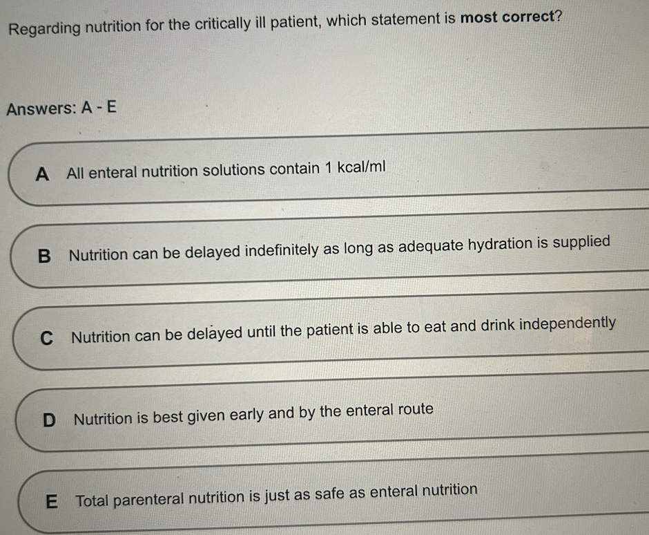 = D: Nutrition is best given early and by the enteral route. All studies in this area suggest early enteral feeding is associated with the best outcomes.