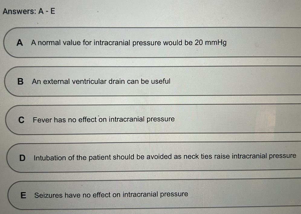 Intubation should be performed whenever the patient needs it, fever and seizures both raise ICP, a normal ICP is 5 - 15 mmHg. EVDs are useful as they drain CS to reduce ICP, and can directly measure ICP.