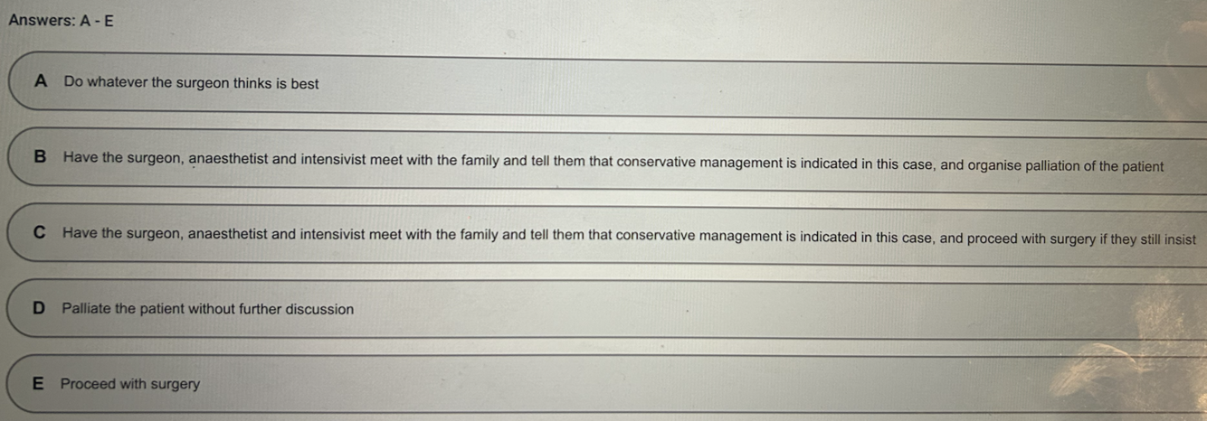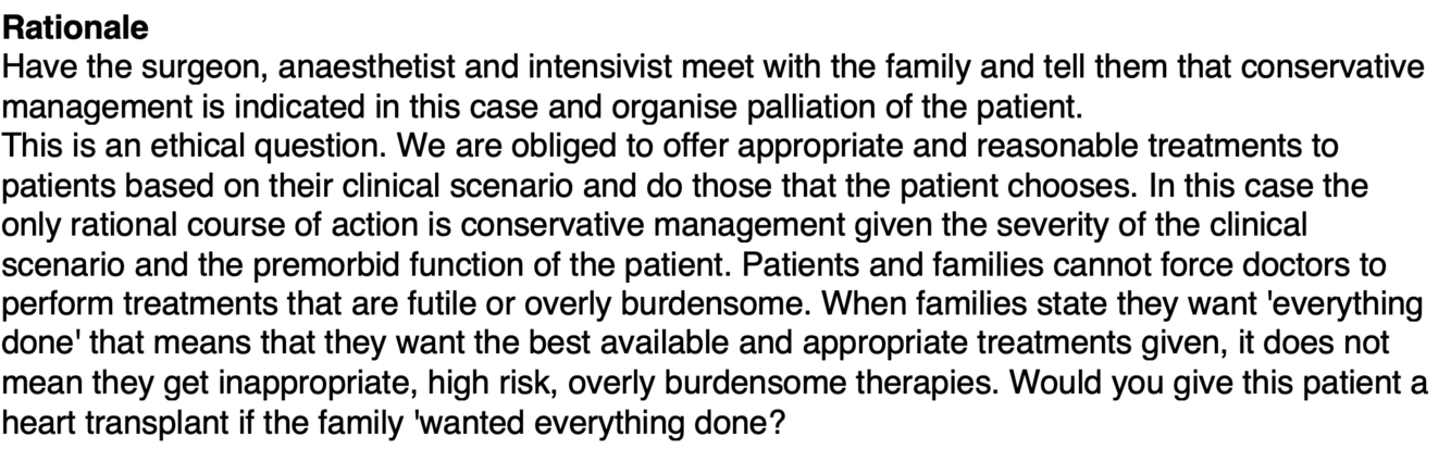 = B: Have the surgeon, anaesthetist and intensivist meet with the family and tell them that conservative management is indicated in this case, and organise palliation of the patient