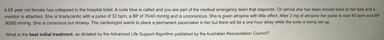 - The patient remains bradycardic post atropine and still has a low perfusion blood pressure and pulse.