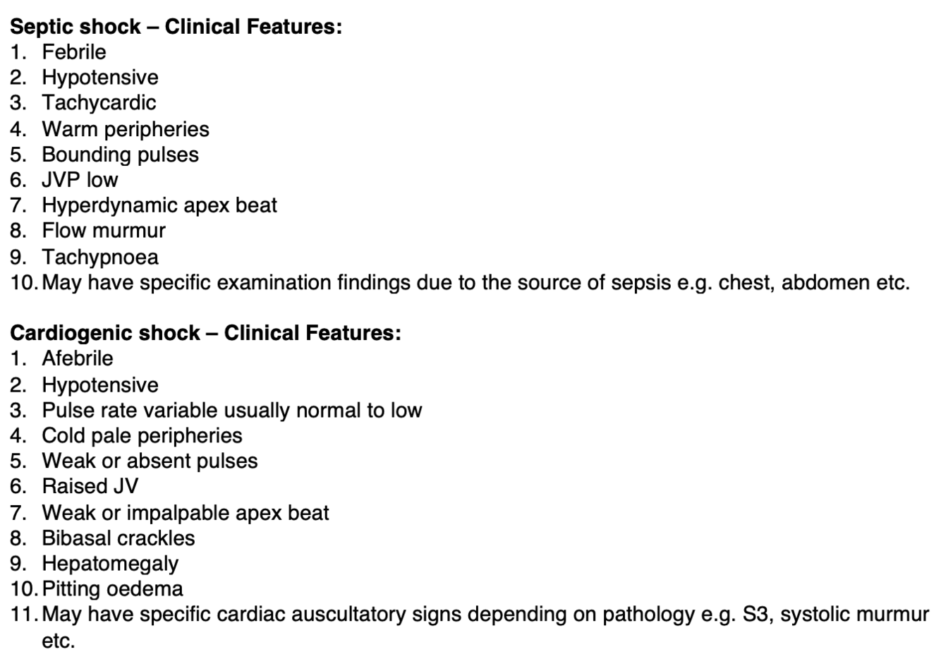 Write short notes comparing and contrasting the general examination findings of a patient in septic shock versus a patient in cardiogenic shock. (There are no marks for history and investigations).