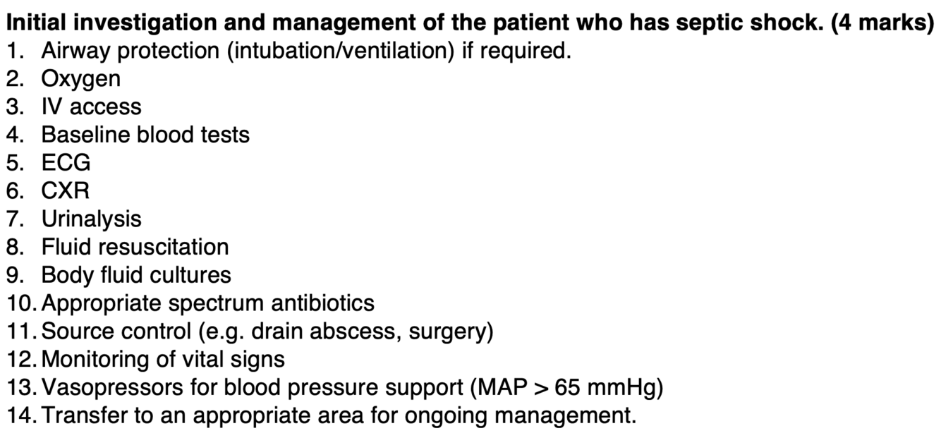 Describe the initial investigation and management of the patient who has septic shock. (4 marks)