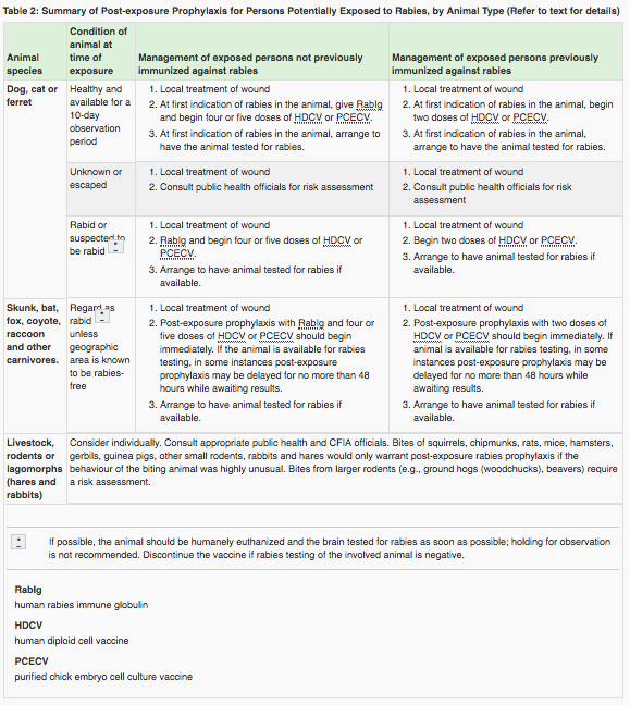 Canadian Immunization Guide Part 4 - Active Vaccines https://www.canada.ca/en/public-health/services/publications/healthy-living/canadian-immunization-guide-part-4-active-vaccines/page-18-rabies-vaccine.html