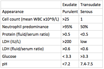 Differential diagnosis of exudative vs transudative pleural effusion.