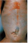 staph aureus, strep pyogenes, gbs, ecoli, gram - stage 1: funisitis, stage 2: cellulitis at insertion, stage 3: abd wall cellulitis st4: nec fasciitis consider syphillis for isolated funisitis tx: cefazolin (1st gen ceph)/clinda if mrsa/ + gent