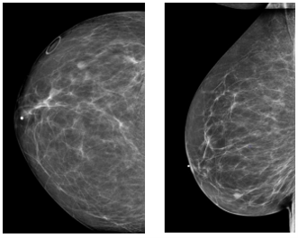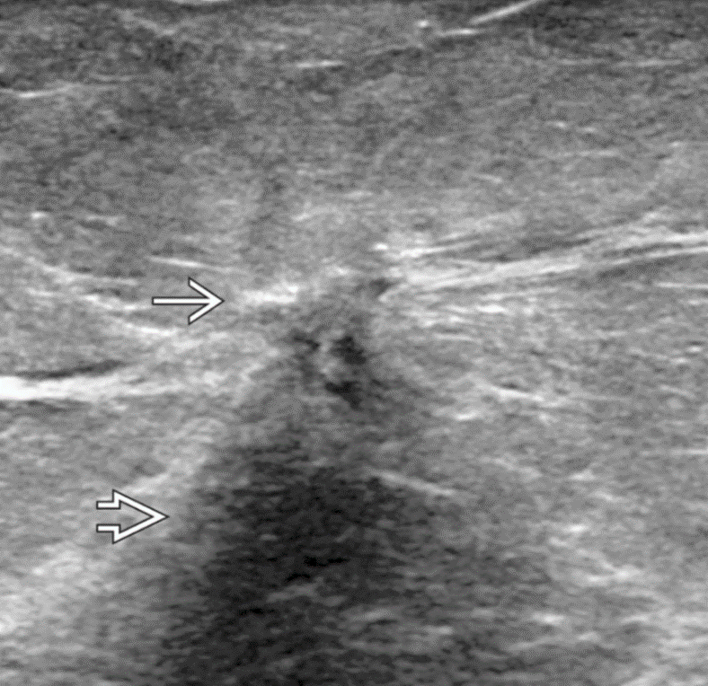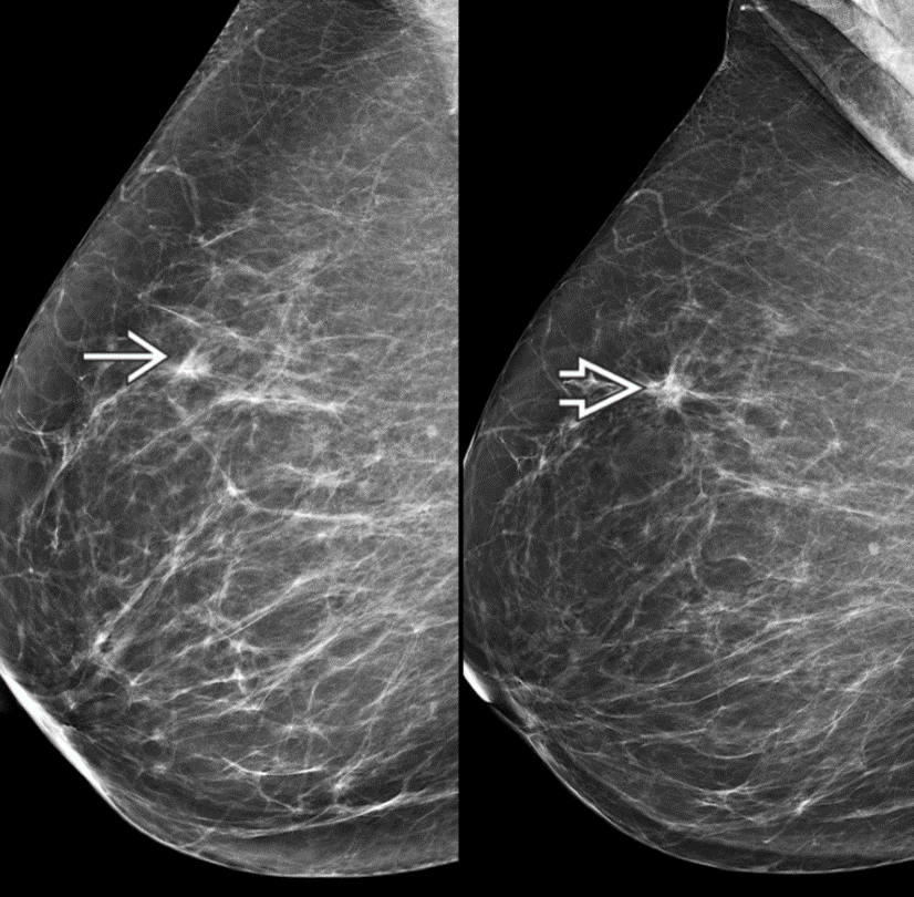 Mammo: Irregular spiculated mass, architectural distortion, asymmetry