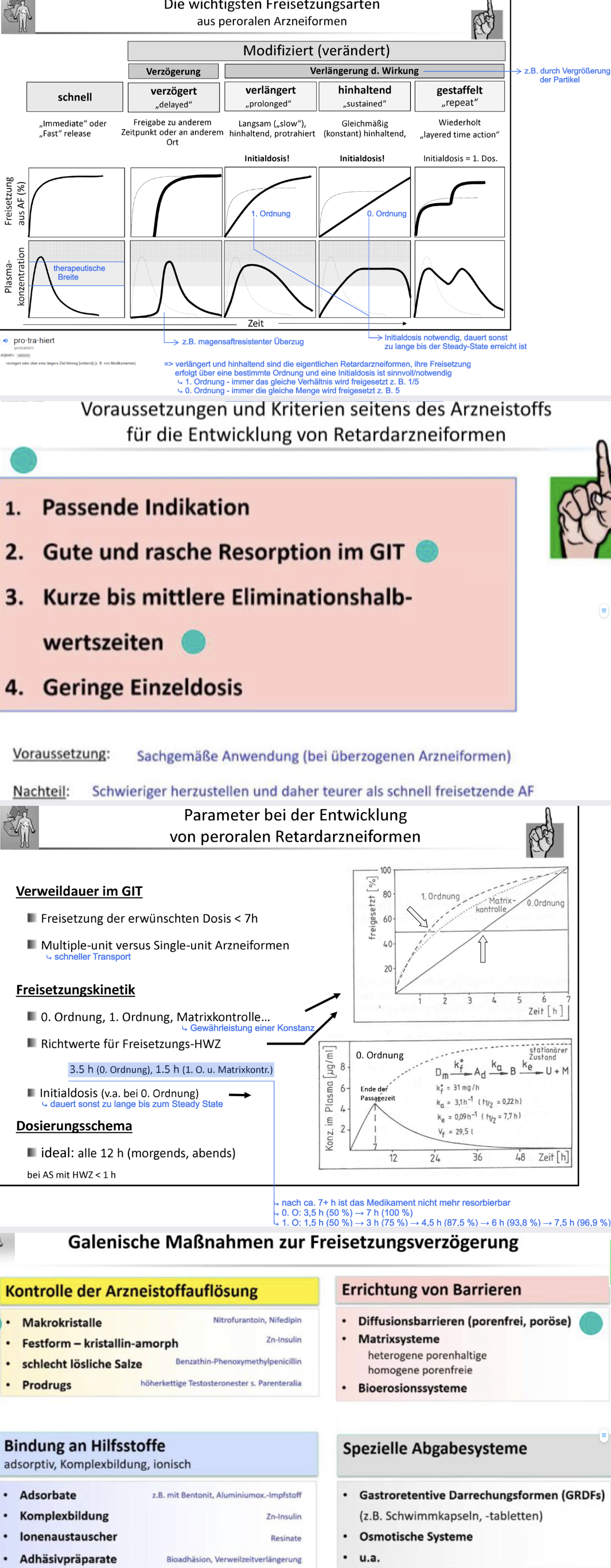 Verzögerung Liberation: Makrokristalle (Nitrofurantoin, Nifedipin), Bildung schlecht löslicher Salze/Prodrugs, senken d. Wst-auflösungsgeschwindigkeit (erhöhen die Partikelgröße, Adsorption an Hilfsstoffe)/d. Freisetzungsrate aus der Arzneiform (Diffusionsbarrieren, Quellung, chemisch; Bioerosion, physikalisch: therapeutische Systeme: Ionenaustauscher, membrankontrollierte Diffusion, pH-abhängige Auflösung der Membran, Matrixkontrollierte Diffusion, Quellungskontrollierte Freigabe, Bioerosionssysteme)