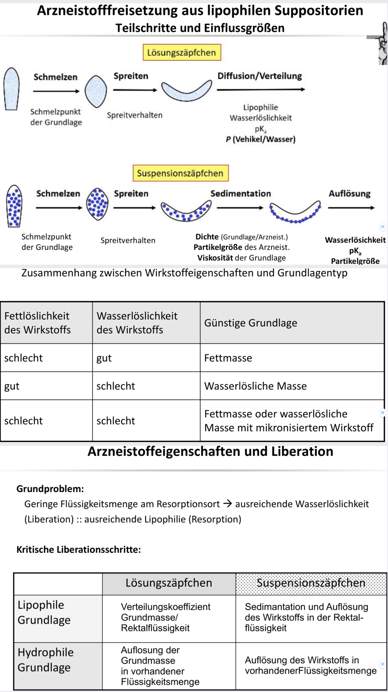 Liberationswege für suspensionszäpfchen, wie beeinflusst bei schlecht Wasserlöslichen oder so ähnlich (dann irgendwas wo man selber begründet muss welche dichte, partikelgröße man wählen würde bei schlecht Wasserlöslichen aber weiß ich nicht mehr genau)