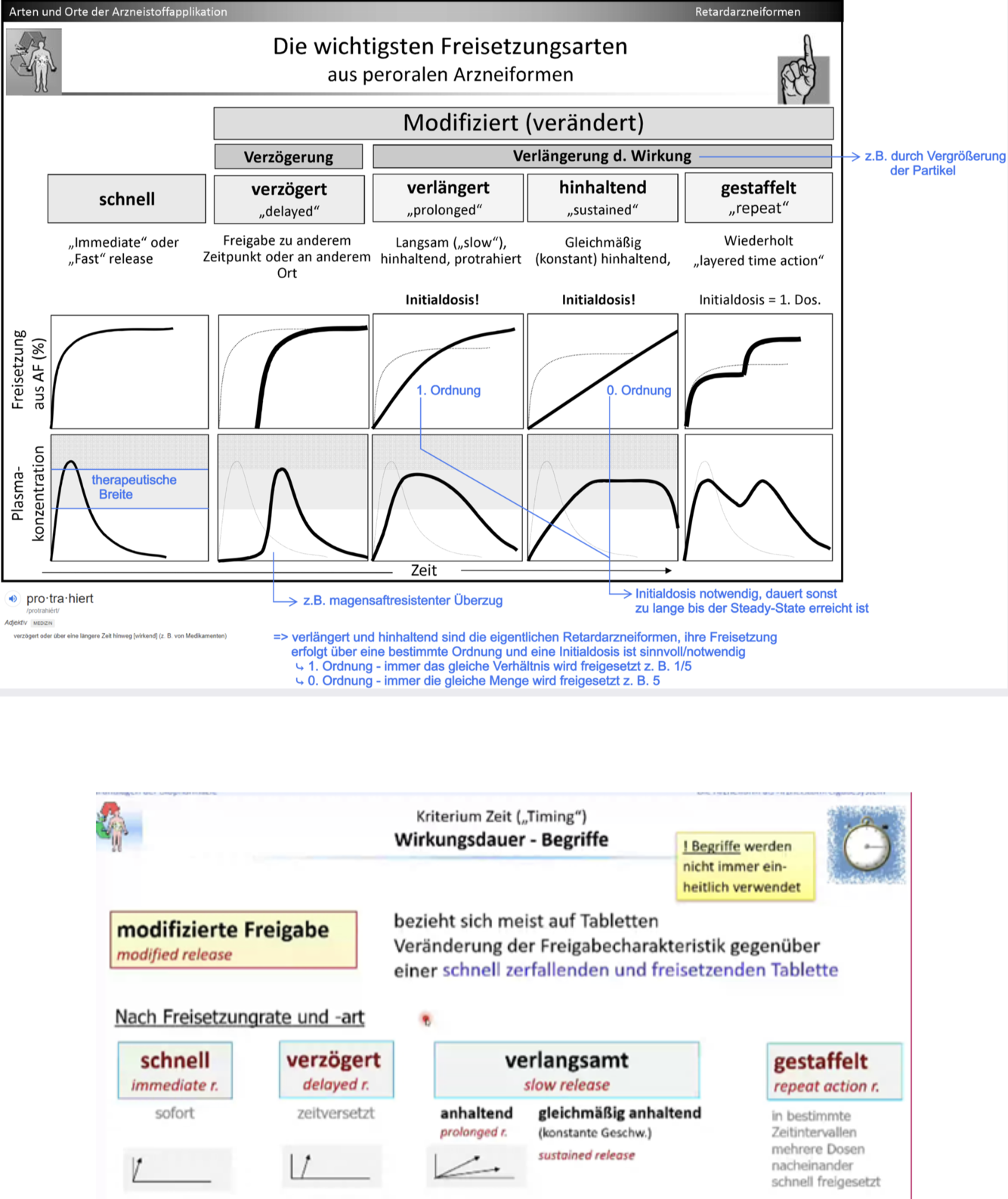 Erklären Sie delayed und repeat action (Freisetzungskurve und Plasmakonzentrationskurve)