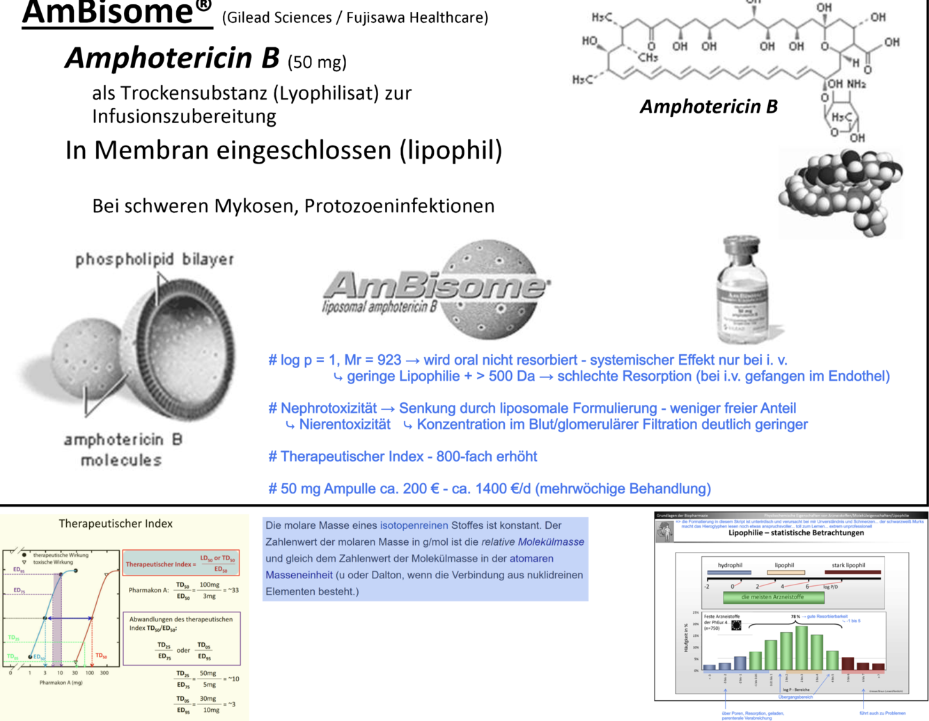 Das Amphotericin ist in diese Vesikel eingelagert und kann relativ gut appliziert werden. Der Einschluss in dem Lipophilen Bereich bedeutet auch, dass der Wirkstoff nicht frei gelöst im Blut vorliegt sondern assoziiert in diesem Phospholipid Bereich der Partikel, das heißt aber andererseits dass diese Partikel die größer sind als die gelösten Moleküle in der Niere die Ausscheidung in der Niere auch langsamer erfolgen. Es herrscht hierein Gleichgewicht (dadurch wird der Therpeutische-Index um das 800 Fache erhöht.
