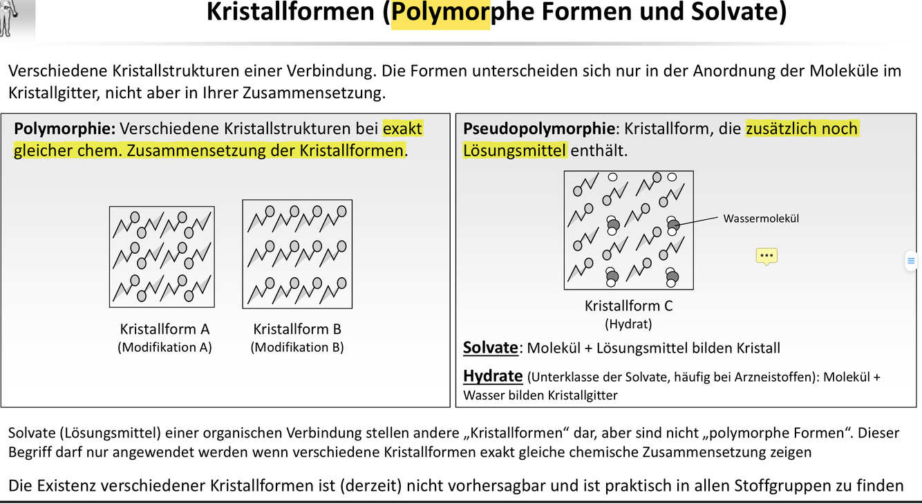 Was versteht man unter Polymorphie/Pseudopolymorphie? Warum muss man dieses Phänomen bei Arzneistoffen berücksichtigen?
