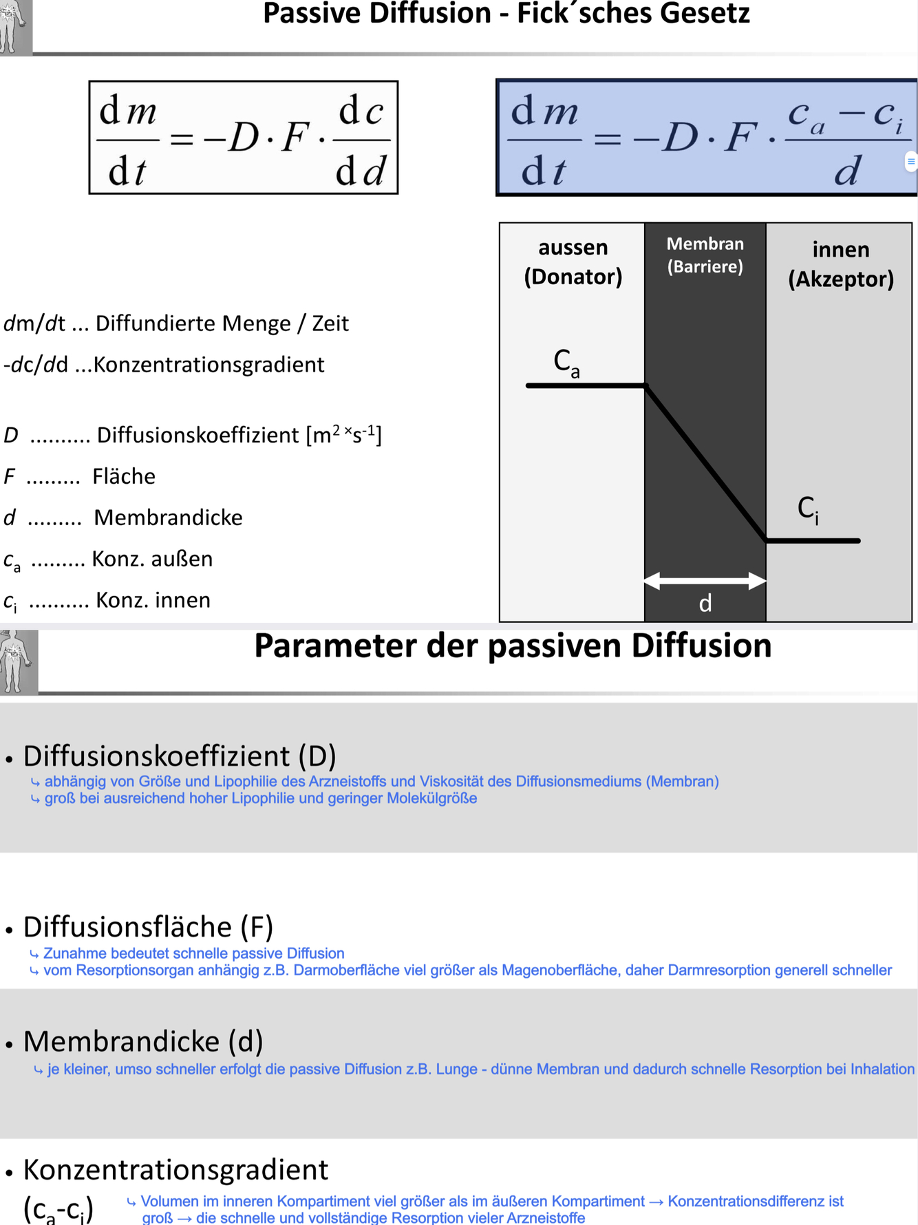 dm/dt = -D x F x (dc/dd) –> dm/dt = -D x F x ((ca-ci) / d)