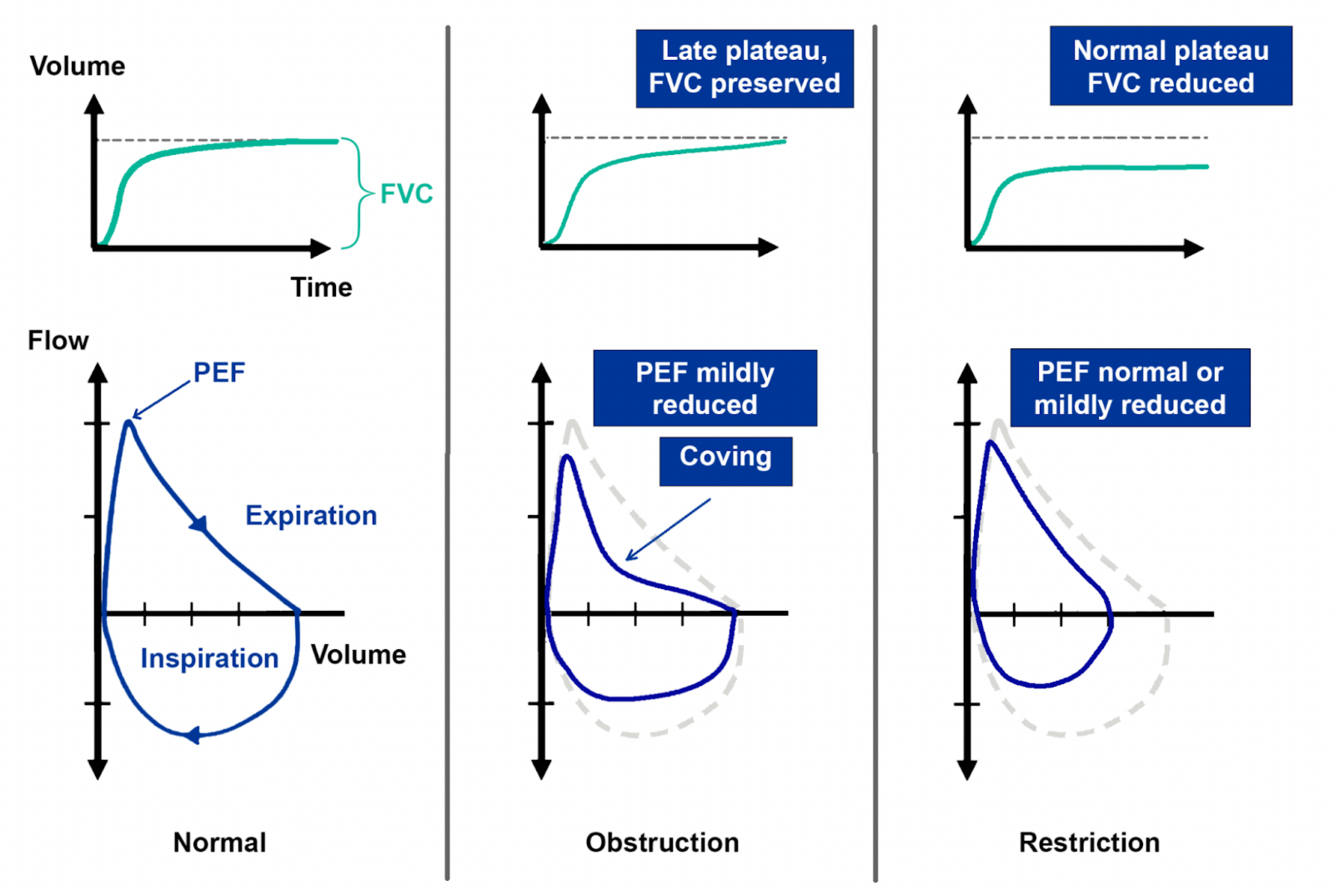 - looking for restrictive pattern which is a proportional reduction in both FVC and FEV1 and a FEV1:FVC ratio >0.8
