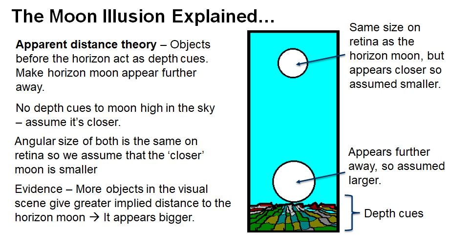 People will usually say that the moon on the horizon looks closer or the same distance as the moon high in the sky! Contradiction between observer’s reports and apparent distance theory due to angular size contrast theory.