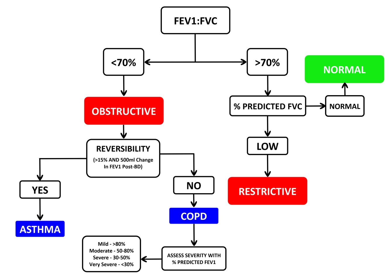 Obstructive (e.g. COPD/Asthma) - Reduced FEV1:FVC (<70%), Reversibility (>15% AND 400ml in Post-BD FEV1) in Asthma but NOT in COPD