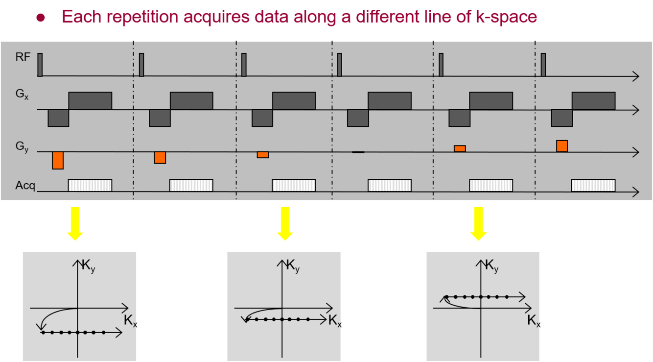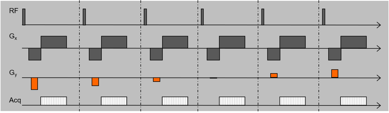 Phase encode gradient applied orthogonally to readout gradient. Adds a position dependent phase change to sample. Stronger gradient = larger dephasing. Parts of sample where phases line up give signal, hence by changing the amount of dephasing, you are probing the amount of each spatial frequency present in the material. (water tank anaology)