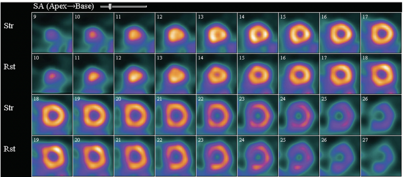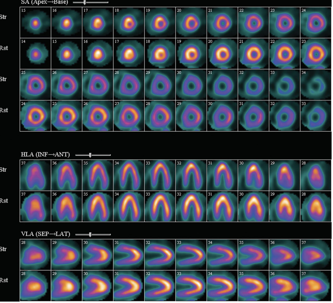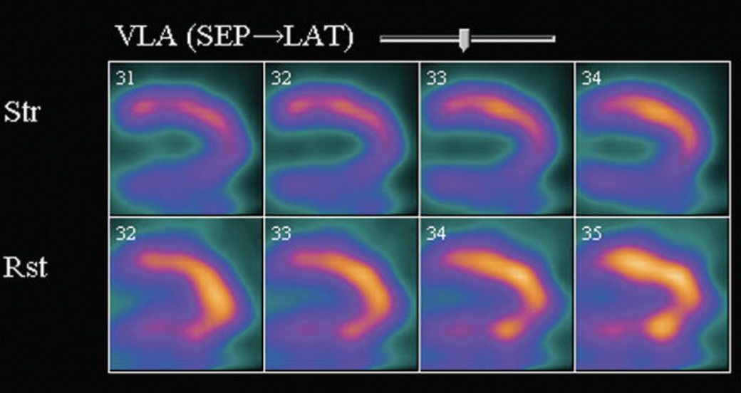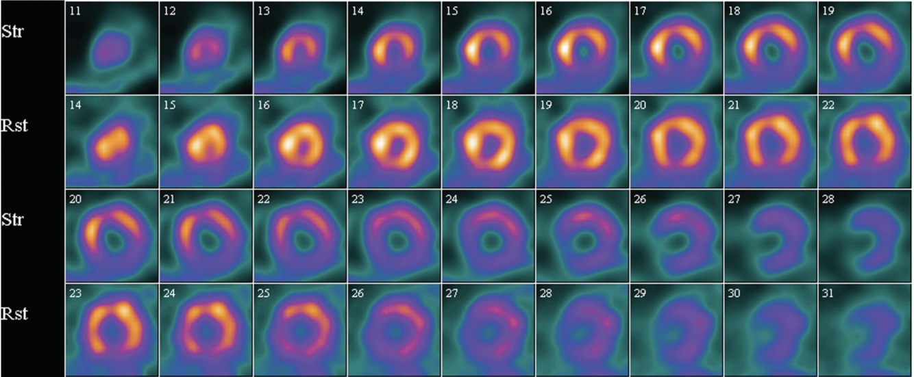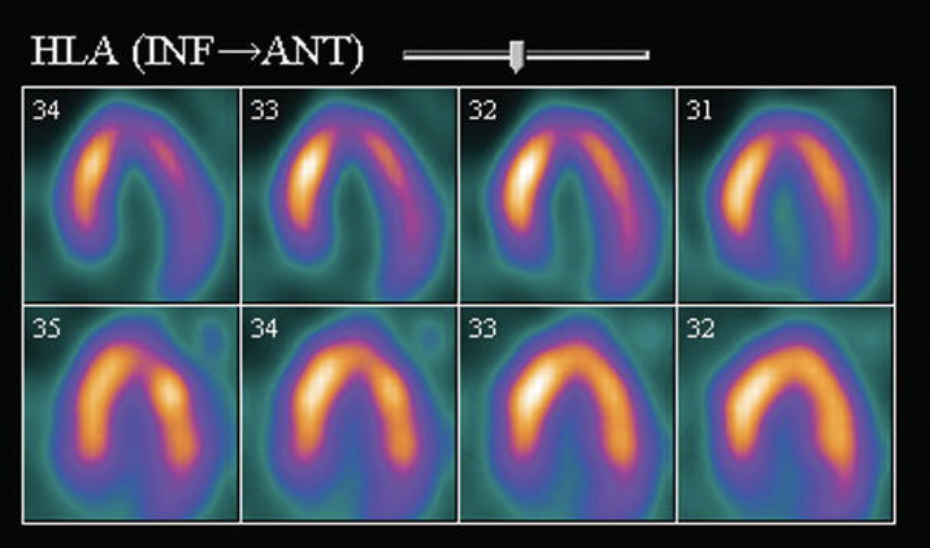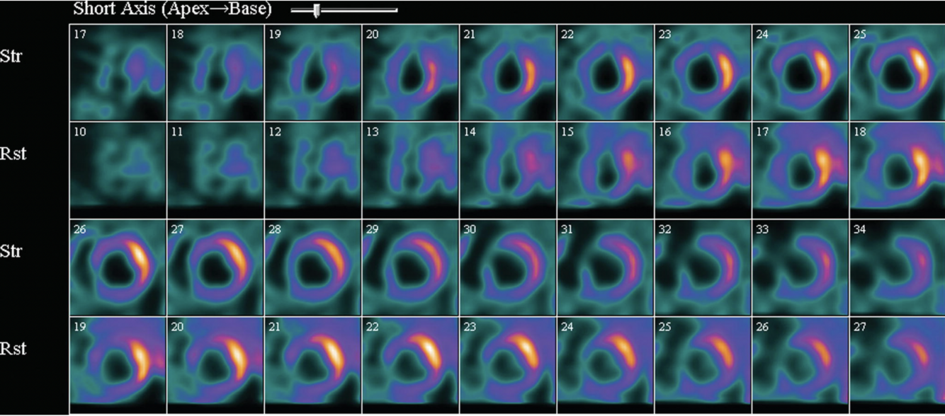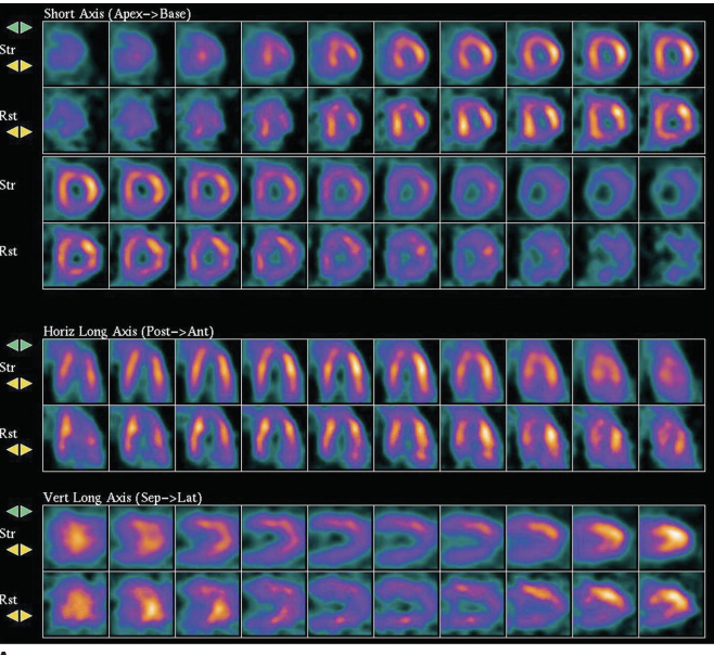 Based on the grainy quality of the rest images due to the low count statistics, we are led to conclude that this is a 1-day study using a low-dose rest, 8 to 12 millicuries, and a high-dose stress, 20 to 30 millicuries, study.