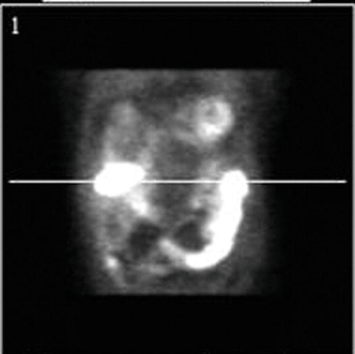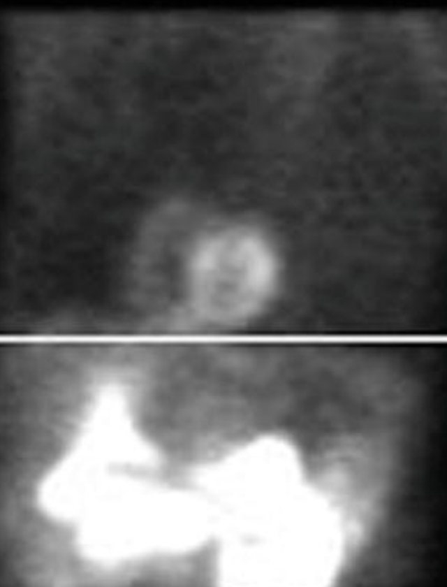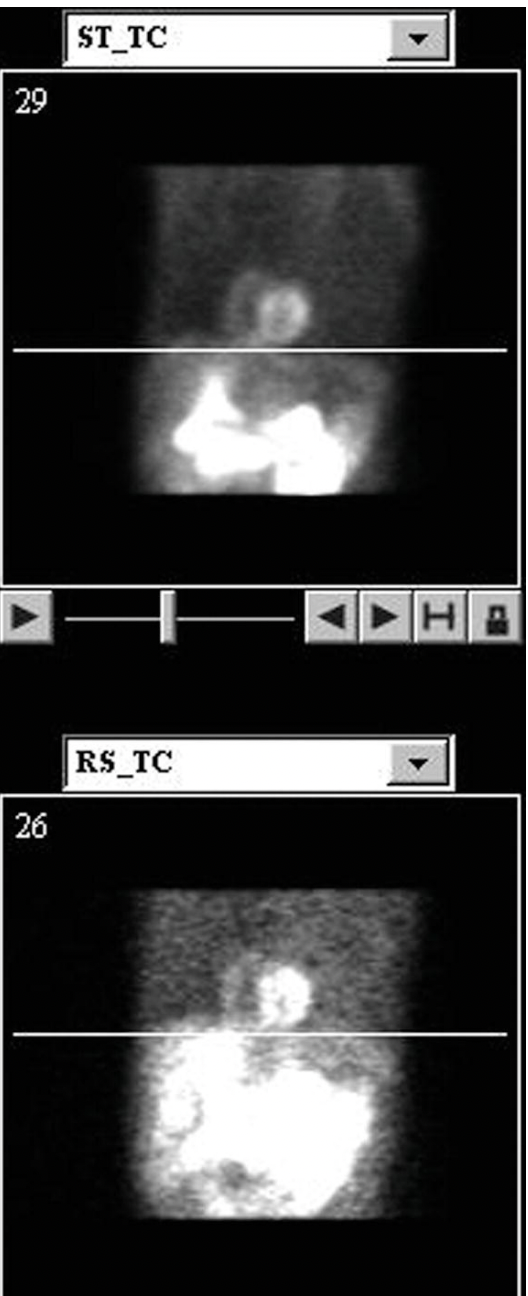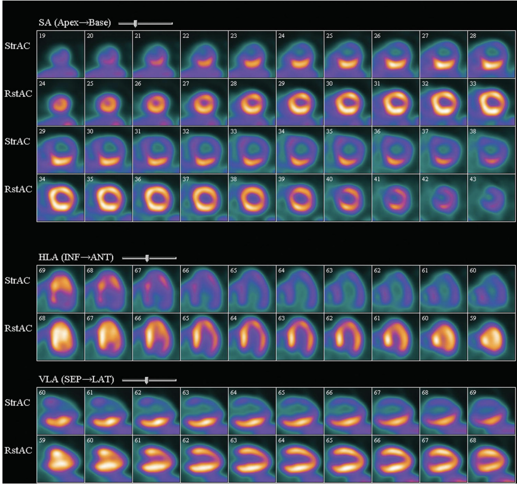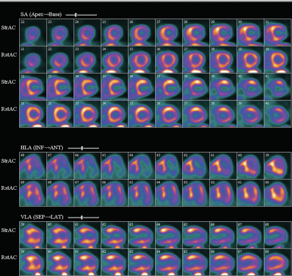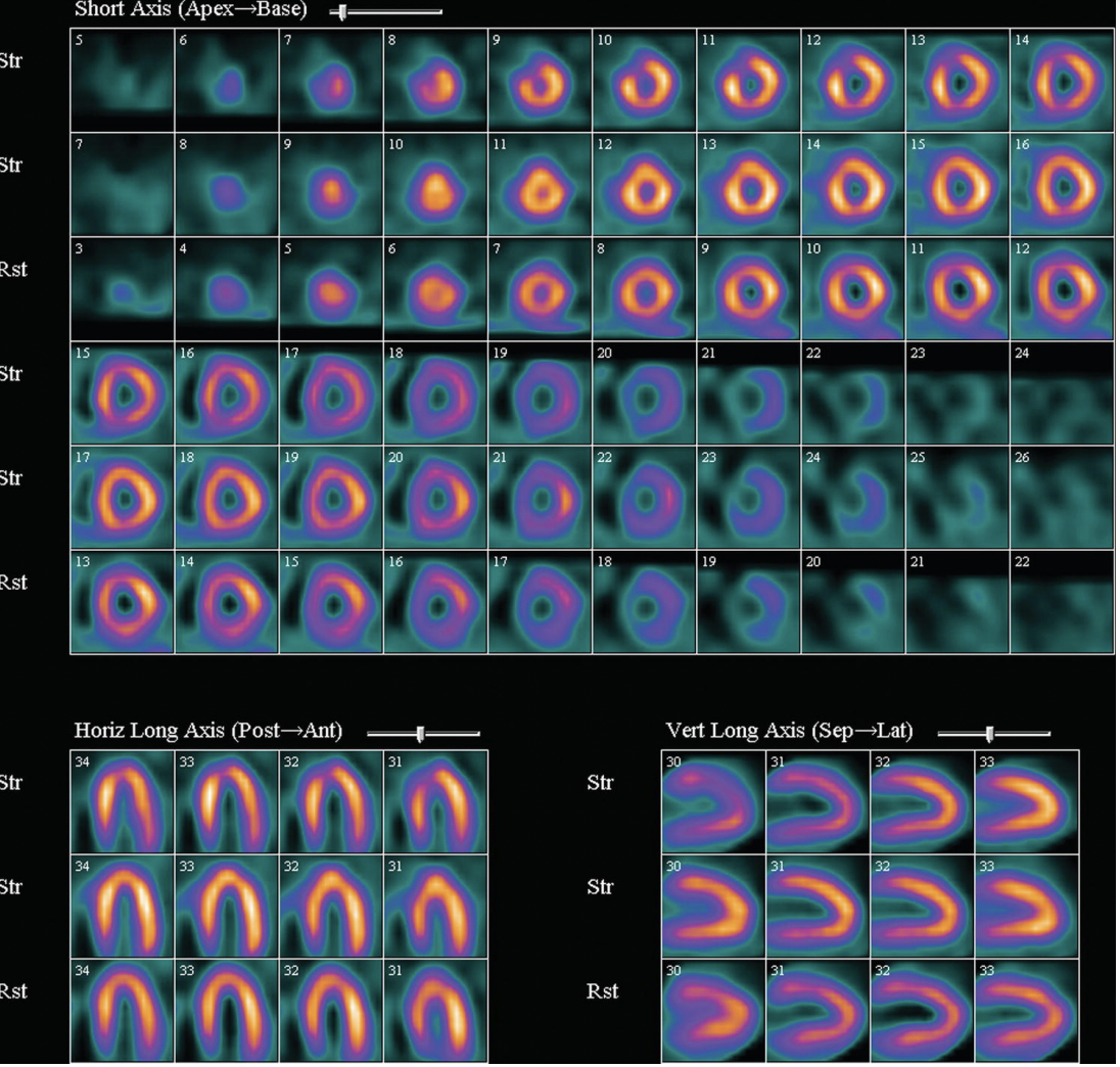 Based on the grainy quality of the rest images due to the low count statistics, we are led to conclude that this is a 1-day study using a low-dose rest, 8 to 12 millicuries, and a high-dose stress, 20 to 30 millicuries, study.