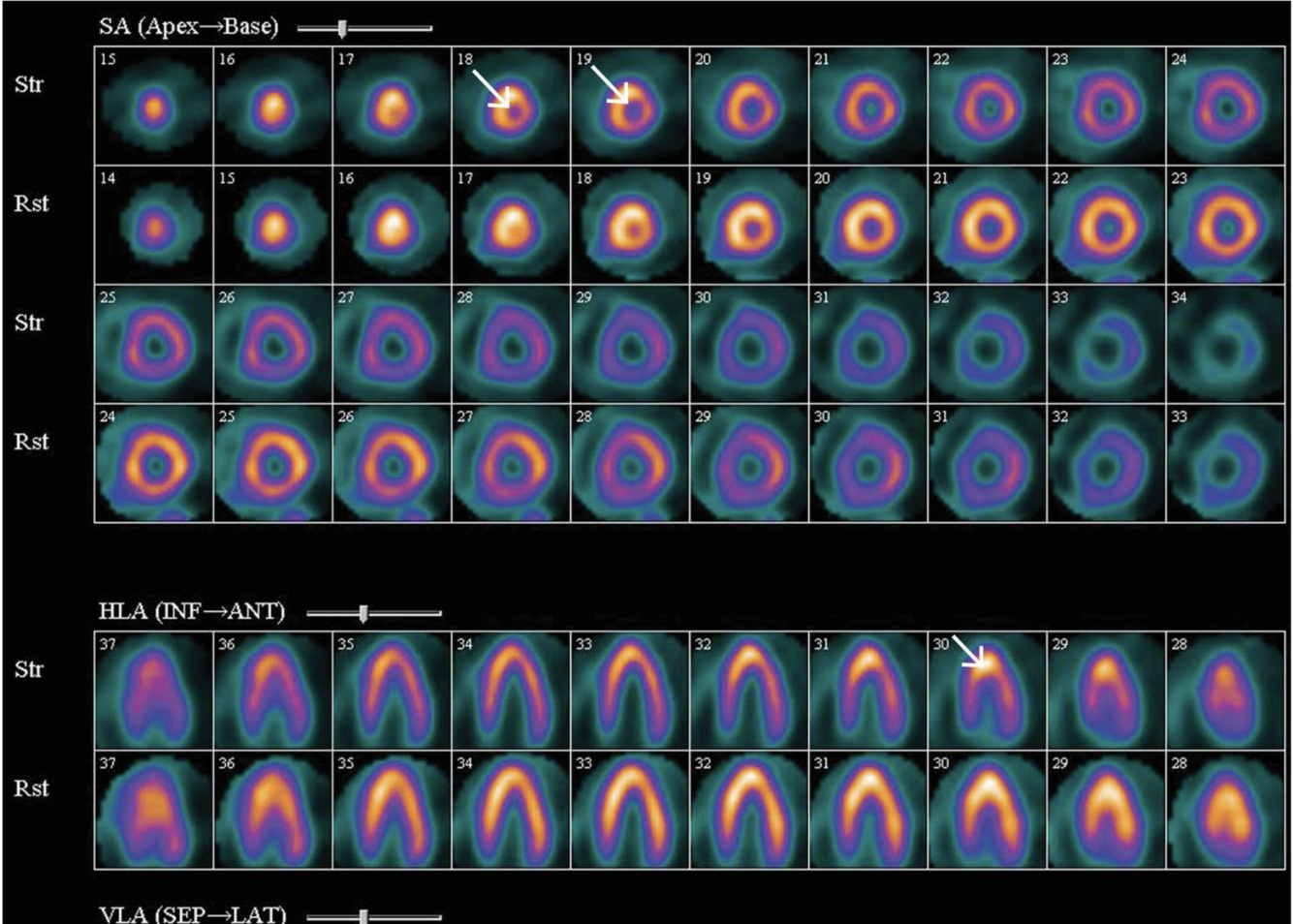 A 39-year-old female with a body mass index of 45 is being evaluated for intestinal bypass surgery. She has hypertension, diabetes, and markedly elevated cholesterol values. A pharmacologic stress SPECT MPI without attenuation correction is performed. The patient has severe chest pain during