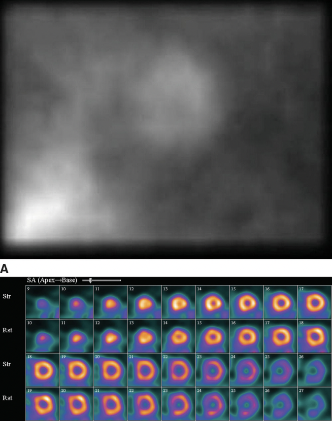 On the rest, but most prominently on the high-dose stress anterior images, there is marked thickening of the diaphragm recognized as a lucency starting from the patient’s right abdominal wall and extending all the way to the heart. Both attenuation by the diaphragm muscle and the contrast between the vascular lungs above and the liver-associated technetium-99m uptake give the dark appearance. With severe COPD, there is marked hypertrophy of the diaphragm resulting in such an appearance on the projection images.