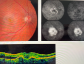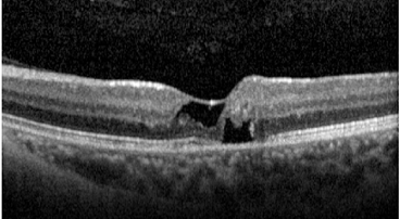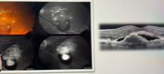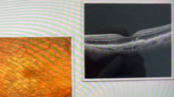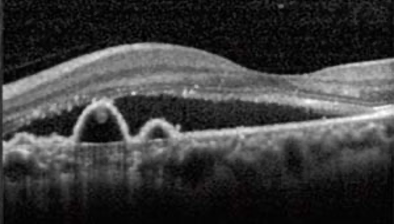 O OCT mostra fluido subretiano, com descolamento do epitélio pigmentar (DEP) em formato de “M”, sugestivo de vasculopatia polipoidal