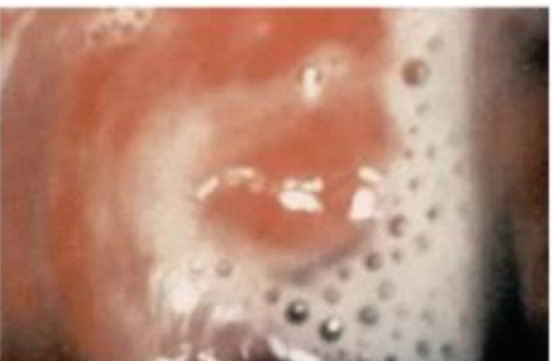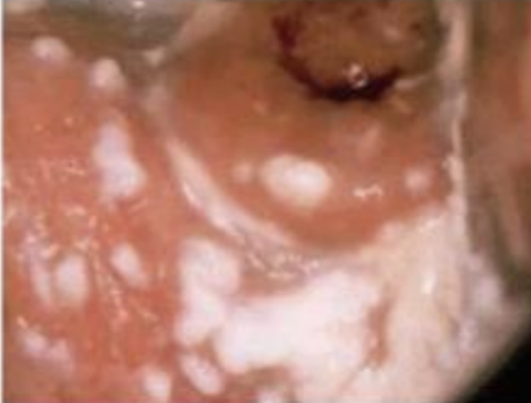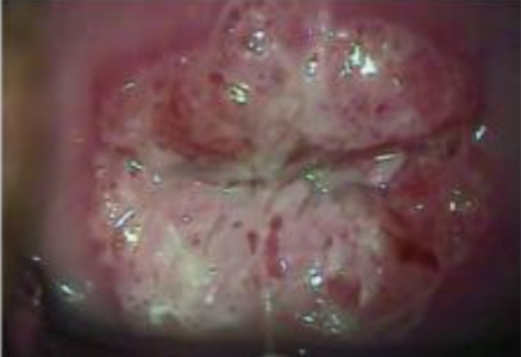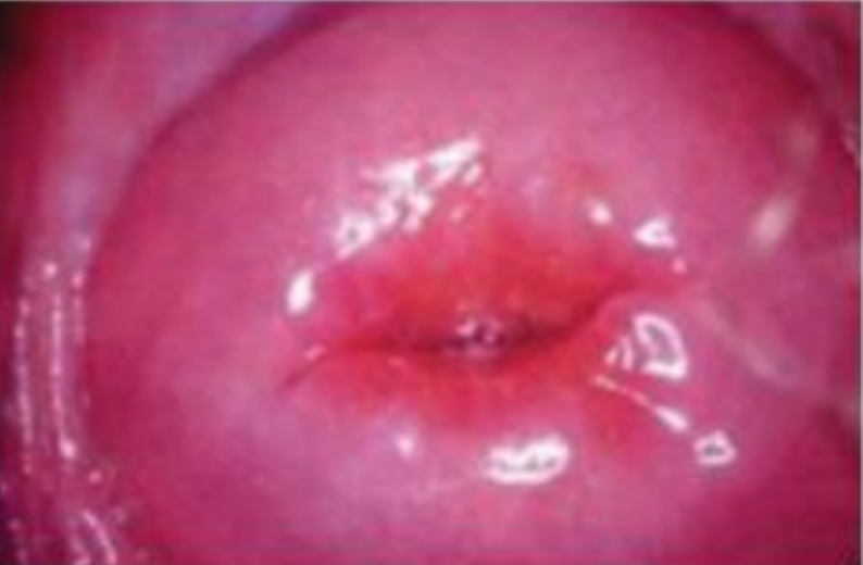 Secreção bolhosa en quantidade moderada através de orifício externo de colo, sugerindo secreção mucopurulenta em pacientes com dip