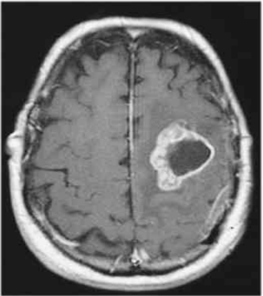 Ces caractéristiques sont celles d’une masse avec un aspect en cocarde (image ovalaire à centre en hyposignal et contours en hypersignal)