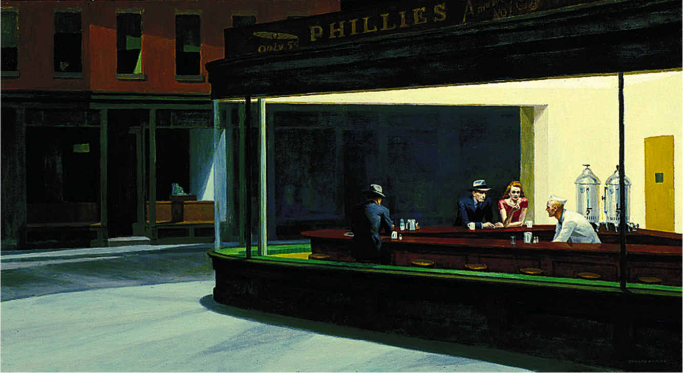 Edward Hopper, Nighthawks (1942) Reaction to Pearl Harbor. Lighting.